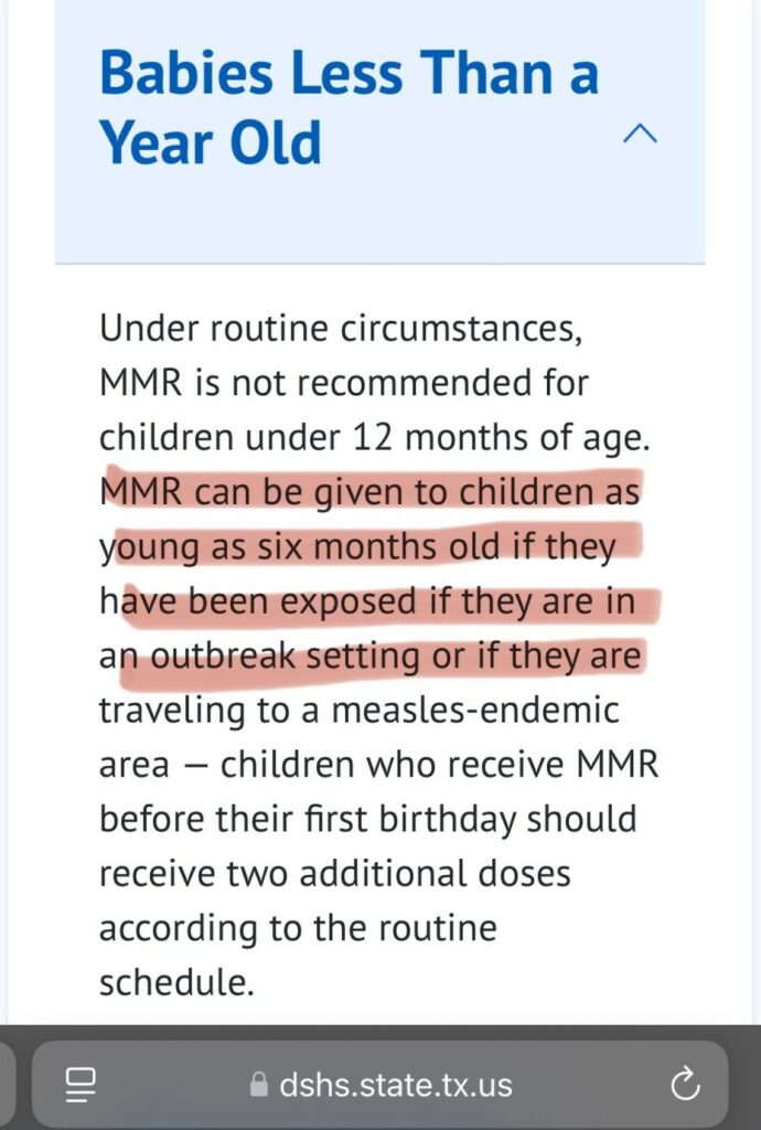 Teksaški državni odjel za zdravstvene usluge trenutno preporučuje MMR cjepivo (živo virusno cjepivo) za bebe od šest mjeseci starosti i za sve koji su bili izloženi ospicama unutar 72 sata od izlaganja.