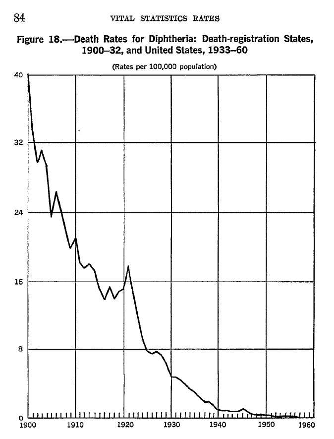 Prvo cjepivo protiv difterije uvedeno je 1926. godine. Između 1900. i 1926. godine, kako je stanovništvo raslo, stopa smrtnosti od ove bolesti već je pala za 81% , s 40,3 na 7,8 smrtnih slučajeva na 100 000 osoba. Cjepivo nije imalo nikakve veze s ovim naglim padom jer nije postojalo nikakvo cjepivo protiv difterije do 1926. godine. Daljnji pad od 1926. do barem sredine 1940-ih također je imao malo ili nimalo veze s cjepivom jer se rijetko, ako ikada, koristilo izvan određenih demografskih skupina u većim gradovima, a smrtnost od difterije smanjivala se sličnom stopom u područjima sa ili bez njegove upotrebe. [1]