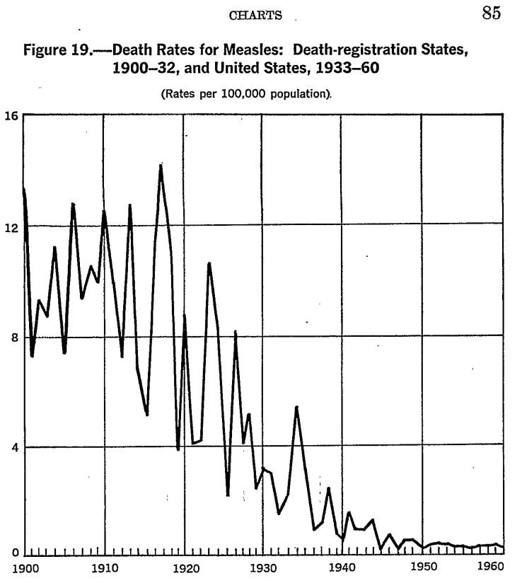 Detaljnijim pogledom, podaci CDC-a pokazuju da je 1900. godine stopa smrtnosti od ospica bila 13,3 smrtna slučaja na 100 000 osoba. Do 1960. godine iznosila je 0,2 smrtna slučaja na 100 000 osoba. Isto je vrijedilo i za 1961. i 1962. godinu. I kao što je gore navedeno, sličan pad, od preko 99% smrtnih slučajeva od ospica, dogodio se između 1900. i 1967. godine u Engleskoj i Walesu. Tek nakon tog pada uvedeno je prvo cjepivo protiv ospica – 1968. godine, pet godina nakon SAD-a.