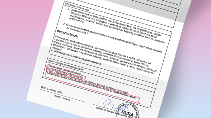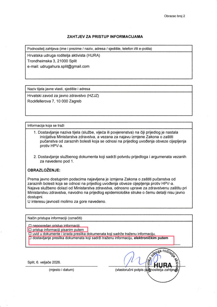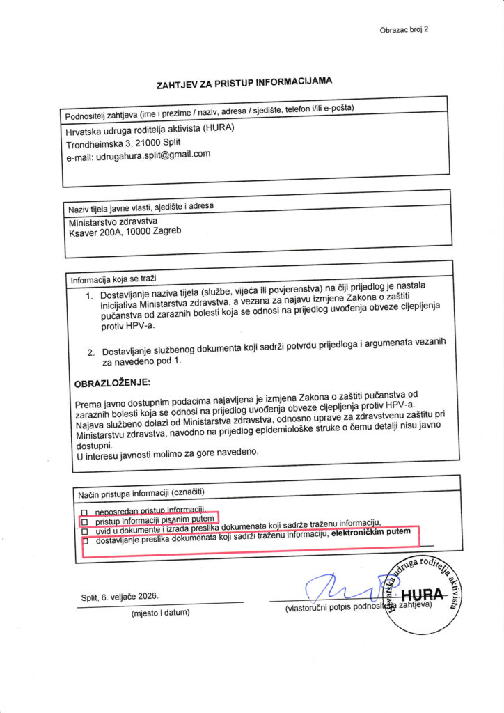 Temeljem Zakona o pravu na pristup informacijama, poslali smo Zahtjev za dostavljanjem svih dostupnih informacija, dokumenta i odluka vezanih uz najavu uvođenja HPV cjepiva u obvezni kalendar cijepljenja.